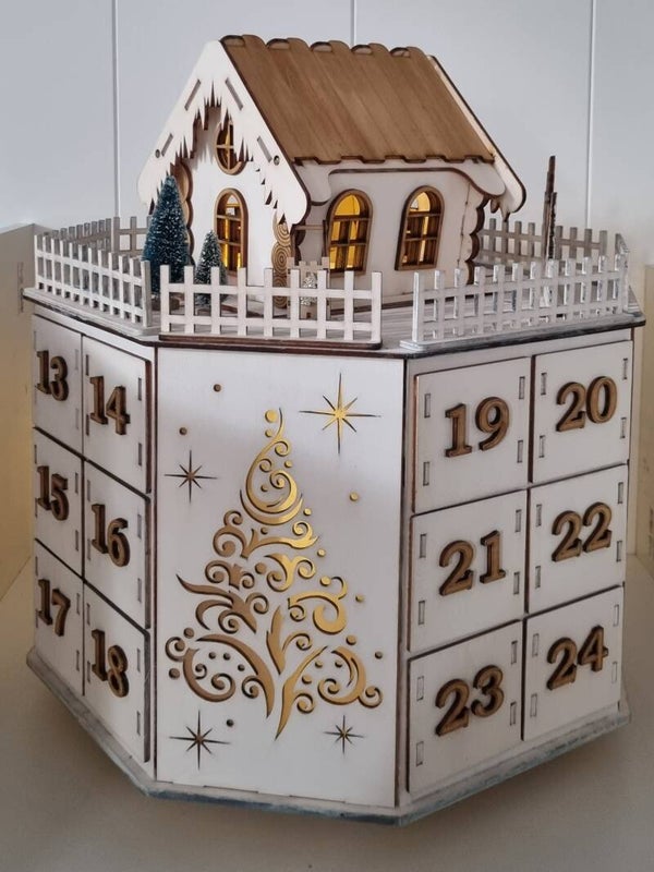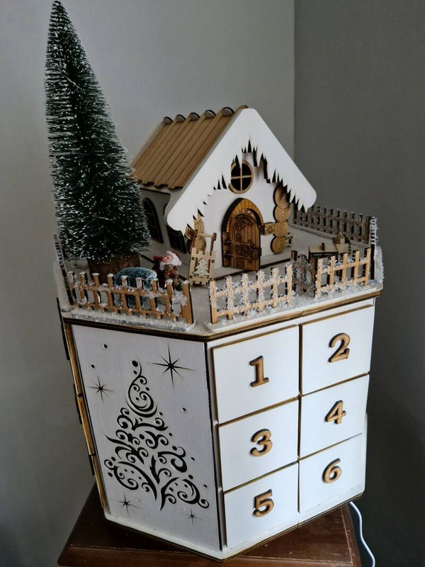Entdecken Sie unseren bezaubernden Adventskalender mit 24 Schubladen und einer charmanten, möblierten Hütte! Mit einer imposanten Höhe von 54 cm und einer Breite von 45 cm ist er perfekt gestaltet für die festliche Jahreszeit und bietet genug Platz für kleine Überraschungen und Leckereien. Die eingebaute Beleuchtung verleiht ihm eine warme, einladende Atmosphäre. Ein ideales Geschenk für Ihre Liebsten oder eine besondere Ergänzung für Ihr Zuhause. Bestellen Sie jetzt und erleben Sie die Vorfreude auf Weihnachten jeden Tag aufs Neue!