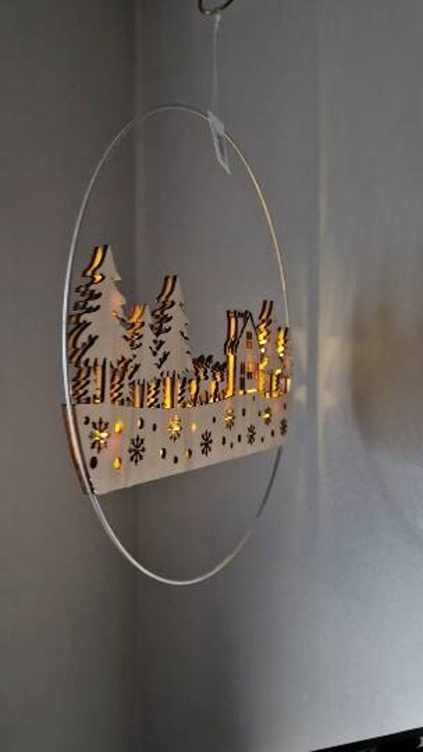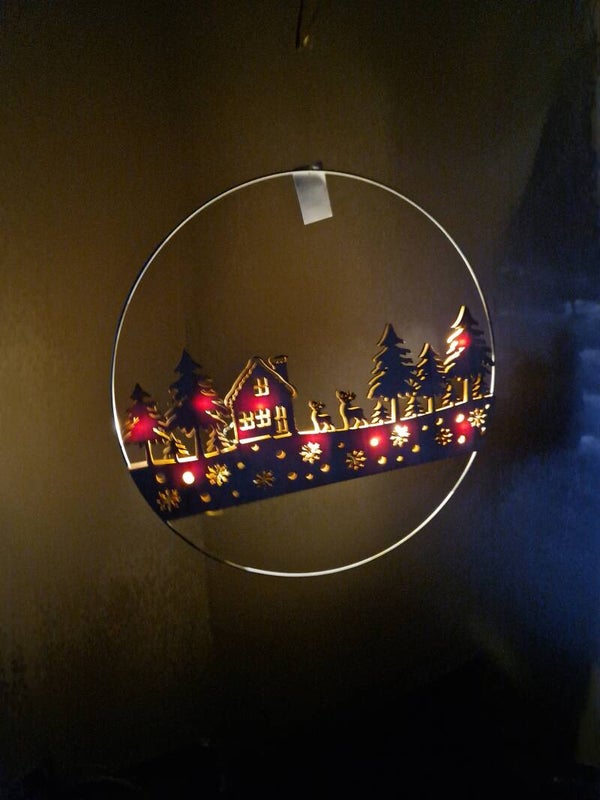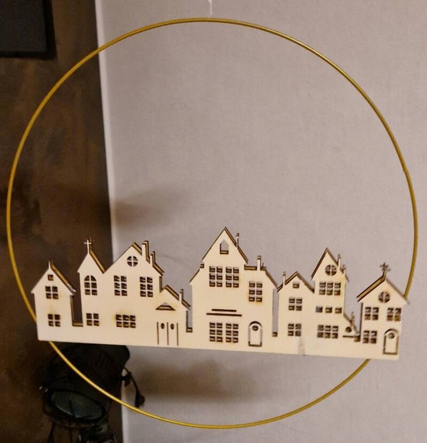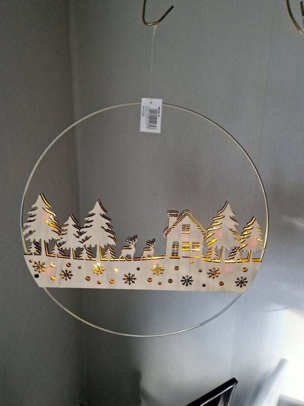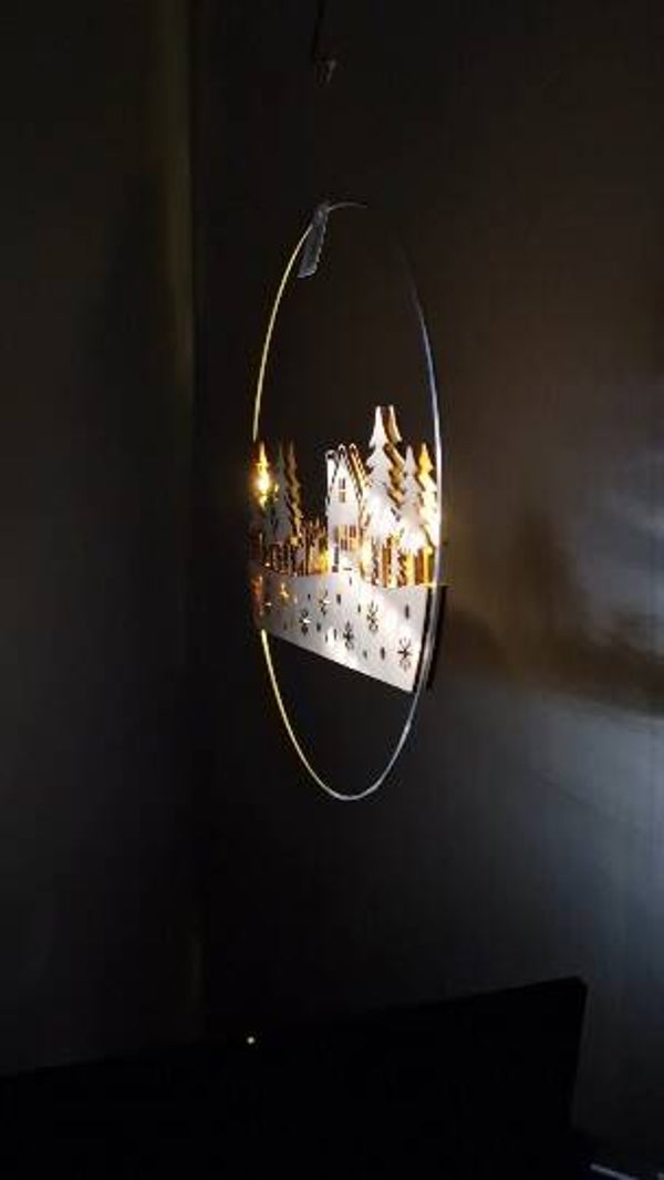 Schaffe eine magische Atmosphäre in deinem Zuhause mit unserem zauberhaften Weihnachtsdorf-Silhouette, das in einem eleganten Metallreif hängt. Die warme Beleuchtung verleiht jedem Raum ein festliches Flair und verbreitet Weihnachtsfreude.